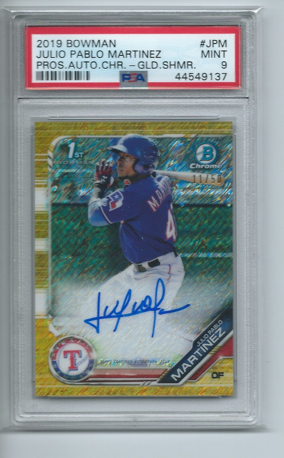 JULIO PABLO MARTINEZ 2019 BOWMAN CHROME GOLD SHIMMER REFRACTOR AUTO #D /50 PSA 9